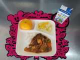 今日の給食は、豚肉といかの中華煮、大学いも、ミニフィッシュ、レーズンパン、牛乳...