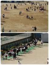 昼休み、たくさんの子ども達が元気いっぱい運動場で遊んでいます。 校舎から運動場を...