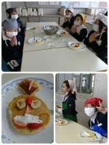 午前中、5年生が調理実習で、パンケーキとフルーツポンチを作りました。 きれいな焼...