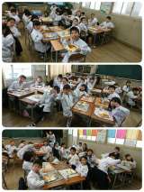 今日の給食は、牛乳、ごはん、きびなごてんぷら、一口がんもとじゃがいもの煮もの、...