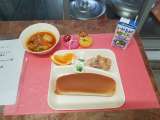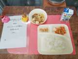 今日の給食は、パン、牛乳、鶏肉のガーリック風味焼き、豚肉と野菜のケチャップ煮、...