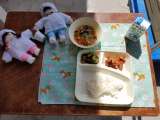 今日の給食は、チキンカレーライス、金時豆と野菜のサラダ、プチトマト、ご飯、牛乳...