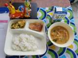 今日の給食は、ごはん、牛乳、鶏肉のてり焼き、じゃがいもとあつあげの煮もの、ごま...