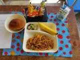 今日の給食は、パン、牛乳、カレースパゲッティ、キャベツのひじきドレッシング、バ...