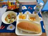 今日の給食は、パン、牛乳、豚肉と野菜のスープ煮、変わりピザ、ミックスフルーツ(...