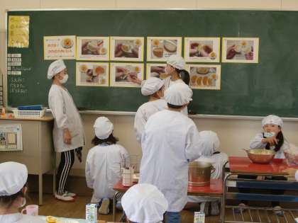 1年生には皮をむくのが難しいので、6年生が「めざせ!かわむきめいじん」で上手な皮のむき方を説明してくれました。静かによく聞いていた1年生、前向きにチャレンジしていました。