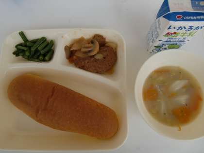 煮込みハンバーグは、児童に人気の一品です。たまねぎ、マッシュルーム、ケチャップ、ウスターソースで作ったソースで、20分ほどハンバーグを煮込んで作ります。