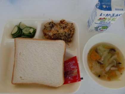 5月22日の給食 公開日 2019/05/22 更新日 2019/05/22 お知らせ ≪今日の献立≫ *食パン *じゃがいものミートグラタン *スープ *キャベツのピクルス *いちごジャム *牛乳 スープには、鶏肉、キャベツ、にんじん、パセリ、しめじが入っていました。きのこが苦手な児童が多いのですが、しめじをがんばって食べていました。 いいね(0)
