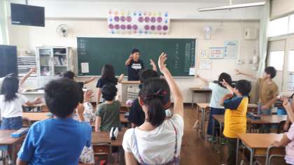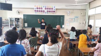 教室では野球等の話でさっそく子どもたちとも打ち解け、休み時間には運動場でふえおにをして遊んでくれました。