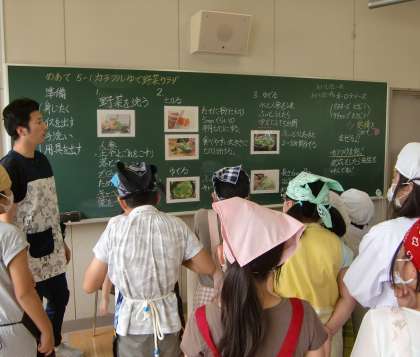にんじんの皮むき、ブロッコリーの切り方、それぞれの食材のゆで方と様々な場面で苦戦する様子が見られましたが、班のメンバーで分担し、声を掛け合って、無事サラダを完成させることができました。自分たちで調理したことがとっても嬉しかったようで、「おいしい!」という声がたくさん聞こえました。