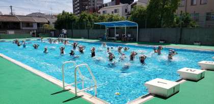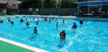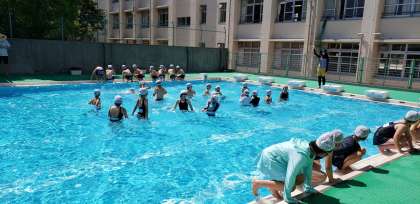 高学年は水慣れから、プールの横をけのび、ばた足、面かぶりクロールといつもの練習です。今日は、楽しいゲームがあるようです。