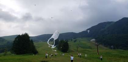 凧揚げ4 公開日 2019/08/02 更新日 2019/08/02 お知らせ 風は絶好調です。強い風をとらえ凧は空高く揚がっています。しかし、昨年同様ポツポツとにわか雨が降ってきましたので、予定より少し早めて3時45分には宿舎に戻りました。雨には、あいませんでした。 いいね(0)