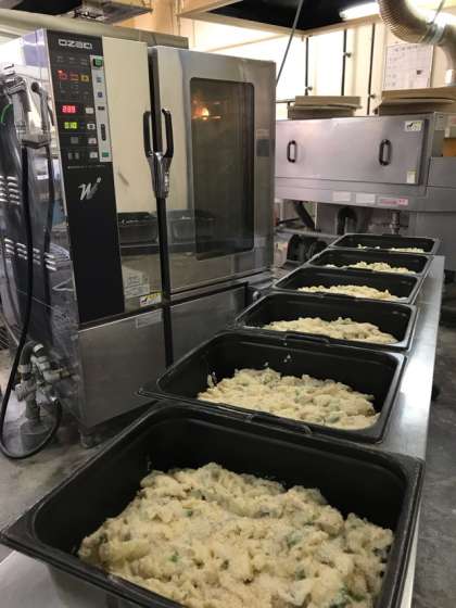 9月に提供するグラタンは、食物アレルギー対応サポート月間であることから、牛乳の替わりに豆乳を使っています。また、具材のマカロニも小麦粉ではなく米粉で作ったマカロニを使用しています。そしてグラタンの表面に焼き色をつけるために振りかけるパン粉も、米粉で作ったものを使用しています。乳・小麦アレルギーのある児童も食べることができます。