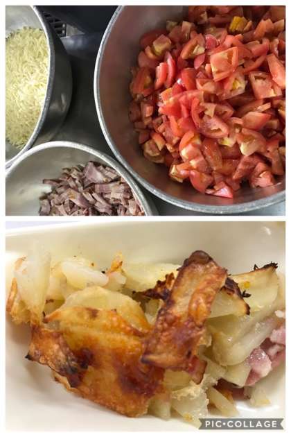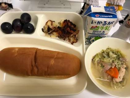 小おかずは「じゃがいもとトマトのチーズ焼き」でした。ベーコン、じゃがいもに下味をつけ、その上に生のトマトとチーズをのせて焼き物機で加熱して出来上がります。カリッとした表面のチーズの部分を食べて「この、カリカリのところが、おいしいねん。」と伝えてくれる児童もいました。
