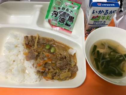 今日の給食の「ピリ辛丼」は、豚肉を主材に、たまねぎ、はくさい、たけのこ、にんじん、むきえだまめが入った具だくさんの丼です。名前にある「ピリ辛」は、トウバンジャンで少し辛みをつけていることに由来しています。ごはんによく合う味でした。