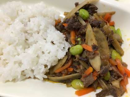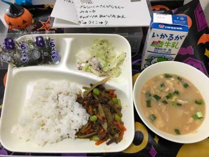 今日の給食の「牛肉のきんぴらちらし」は、牛肉、ごぼう、にんじん、むきえだまめを使ったちらしずしです。ご飯と具を混ぜ合わせ、その上からきざみのりをかけることで風味を添えています。すし飯ではなく、具材に酢の風味を加えていて、日中まだ暑さが残る中、さっぱりと食べられる味でした。「おいしいよ。」、「ちょっと酸っぱい。」等の意見が聞かれましたが、どのクラスもよく食べられていました。