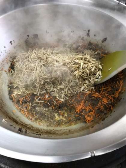 (写真2:釜で炒める牛肉のきんぴらちらし)