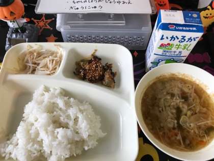 「ソーキ汁」は、沖縄の郷土料理です。ソーキは豚のあばら肉(豚ばら肉)のことで、給食では豚ばら肉をいったんゆでて、余分な脂を落としてから使用しています。具材には切昆布が入り、豚肉、野菜、かつおだし、全ての旨味が合わさった、とてもおいしい汁ものでした。