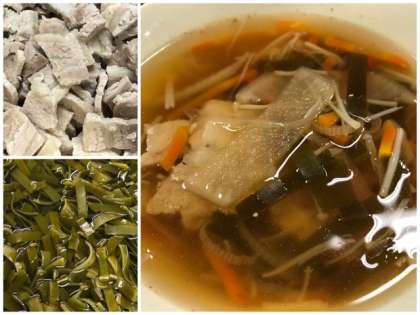 (写真4:写真右から、ソーキ汁、ゆでた豚肉、切昆布)