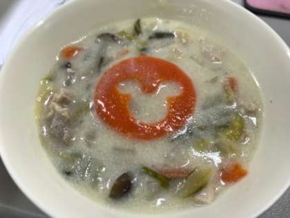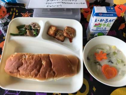 今日の給食の「はくさいのクリーム煮」は、鶏肉とはくさい、たまねぎ、チンゲンサイ、にんじん、しめじを使用しています。牛乳とクリームが入り、でんぷんでとろみをつけたクリーム煮です。素材の味が感じられる、優しい味の煮ものでした。調理員さんが「ラッキーにんじん」を入れてくれていたので、「今日はかわいいのが入ってたよ!」と教えてくれる児童もいました。
