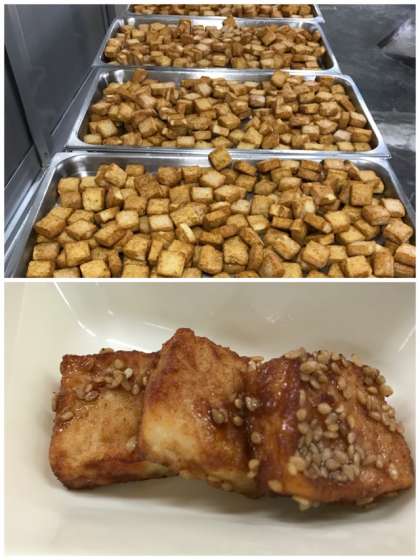 「あつあげのごまじょうゆかけ」は、焼き物機で焼いたあつあげに、ごま油といりごまが入った中華風の調味液をかけています。2年生では、あつあげのおかわりの列ができているクラスもありました。