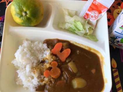 今日の給食の「ポークカレーライス」は、小麦を原材料に使用していない「米粉のカレールウの素」を使っています。小麦アレルギーのある児童も食べることができます。今日は調理員さんがラッキーにんじんを入れてくれていました。「見て!二つもラッキーにんじんが入っていたよ。」と笑顔で教えてくれる児童もいました。カレーは多くのクラスでおかわりの列ができていました。