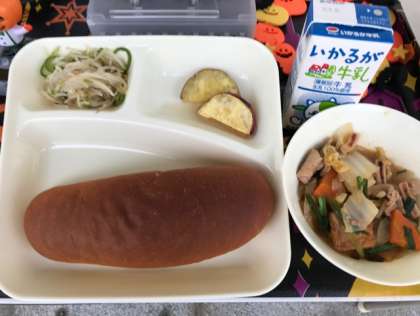 今日の給食の「豚肉といかの中華煮」は、豚肉といかを主材にした中華風の煮ものです。あつあげを使用することで、ボリュームが出ています。はくさい、たまねぎ、にんじん、にらが入り、赤みそとトウバンジャンが中華風の味を引き出しています。