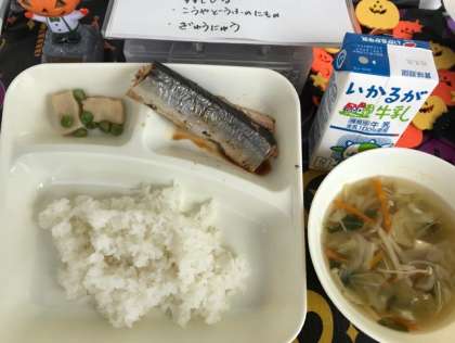 今日の給食の「さんまのさんしょう焼き」は、焼き物機で焼いたさんまに、さんしょう風味のしょうゆだれをかけています。さんしょうの風味の甘辛いたれはさんまによく合い、ごはんのすすむ味でした。
