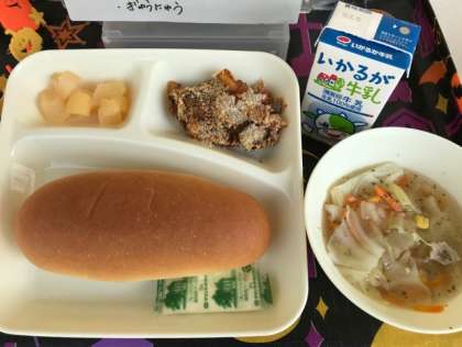 今日は調理員さんが、ハロウィンの可愛らしい手描きのイラストのついたパッケージに、添加物のソフトマーガリンを入れてくれていました。給食を取りに来た当番の児童は「これ何?すごい!!」と、とても喜んでいました。