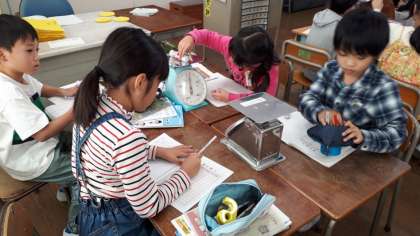 最初に重さの見当をつけてから重さを量り、予想と実際の重さを比べました。