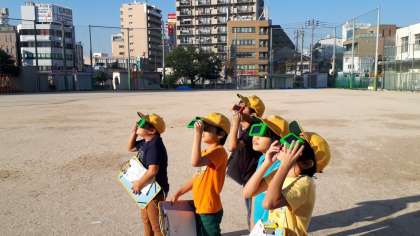 運動場にある遊具や自分の影の向きを確認し、太陽は影の向きと比べてどちら側に見えるか、遮光板を使って調べました。