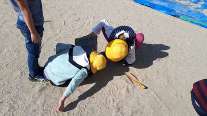 手で直接感じられる様子を比べたり、温度計を使って地面の温度を比べたりしました。