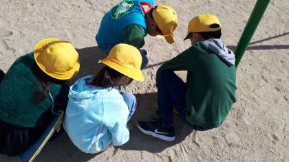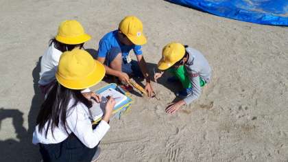 今日はとてもよく晴れていたので、理科の実験で、日なたと日かげでは地面の様子にどのような違いがあるのかを調べました。