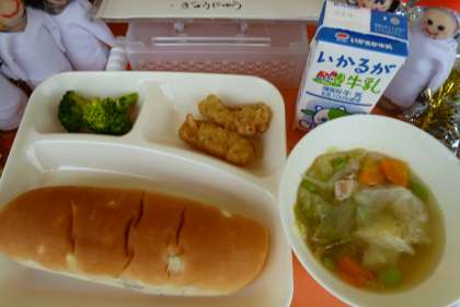 11月25日(月)の給食 公開日 2019/11/25 更新日 2019/11/25 お知らせ 《今日の献立》 *おさつパン *白身魚のフリッター *スープ煮 *ブロッコリーのサラダ *牛乳 今日の給食の「白身魚のフリッター」は、タラに卵を使わない衣をつけた製品を、油で揚げています。サクッとした衣が特徴です。児童の皆さんもとてもよく食べていました。 (写真1:今日の給食) (写真2:白身魚のフリッター) いいね(0)