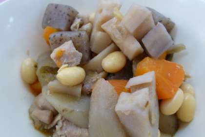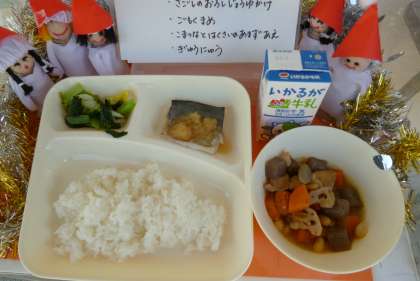 11月29日(金)の給食 公開日 2019/11/29 更新日 2019/11/29 お知らせ 《今日の献立》 *ごはん *さごしのおろしじょうゆかけ *五目豆 *こまつなとはくさいの甘酢あえ *牛乳 今日の給食の「五目豆」は、大豆の他に、鶏肉、こんにゃく、にんじん、れんこん、ごぼう、切りこんぶが入っていました。とてもかみごたえのある献立でした。苦手な児童も多くいましたが、よくかんでしっかりと食べている児童もたくさんいました。 (写真1:今日の給食) (写真2:五目豆) いいね(0)
