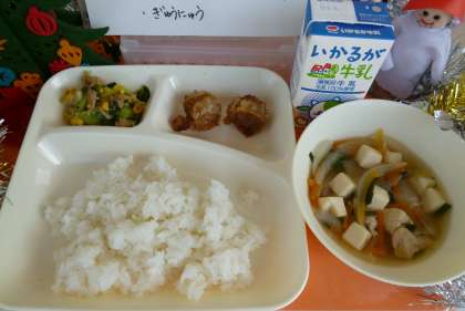 今日の給食の「あげシューマイ」は、外側はカリッと揚がり、中は肉の味がしっかりと感じられる、児童に人気の一品でした。