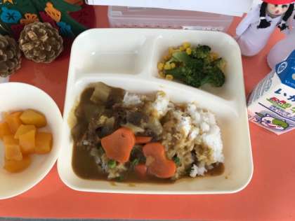 今日の給食の「冬野菜のカレーライス」は、児童の皆さんに人気のあるカレーライスに、旬のだいこん、れんこんなどが入っていました。また、給食調理員さんがクリスマスにちなんだ「ベル」と「ブーツ」のラッキーにんじんを入れてくれていました。どのクラスも、カレーライスはきれいに食べられていました。