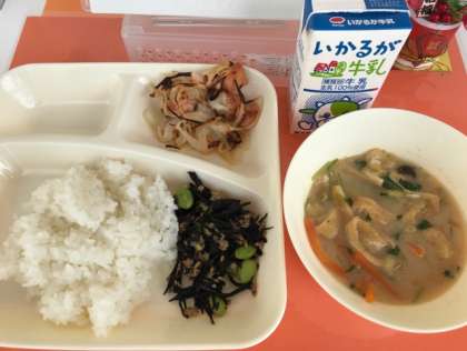 「栄養たっぷりえだまめひじきご飯」は、献立のねらいの通り、えだまめの色が鮮やかで、栄養価も高く、ご飯によく合う一品でした。児童の皆さんも、よく食べていました。