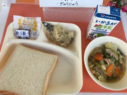 今日の給食の「あじのレモンマリネ」は、年に1度使用するあじにでんぷんをまぶして油で揚げ、炒めたたまねぎとレモン汁などで作った調味液をからませています。からりと揚がったあじに調味液が程よくしみこみ、とてもおいしい一品でした。児童の皆さんもよく食べていました。