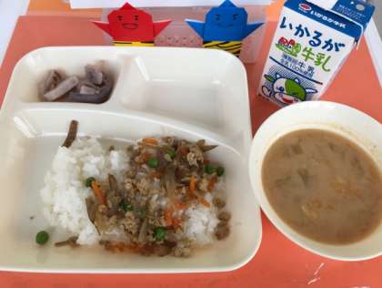 2月7日(金)の給食 公開日 2020/02/07 更新日 2020/02/07 お知らせ 《今日の献立》 *鶏ごぼうご飯 *みそ汁 *焼きれんこん *牛乳 今日の給食の「鶏ごぼうご飯」は、しょうがとごぼうの風味が感じられるごはんによく合う一品でした。いつもよりも児童の皆さんのごはんを食べる量が多かったです。 「焼きれんこん」は、程よい塩加減で、シャキシャキとした食感がとてもおいしい一品でした。 (写真1:今日の給食) (写真2:焼きれんこん) いいね(0)