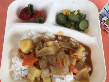 2月18日(火)の給食 公開日 2020/02/18 更新日 2020/02/18 お知らせ 《今日の献立》 *ポークカレーライス *きゅうりとコーンのサラダ *いちご *牛乳 今日の給食の「ポークカレーライス」は、児童のみなさんにとても人気のある献立でした。給食調理員さんがラッキーにんじんを入れてくれていました。児童の皆さんは、いろいろな形のラッキーにんじんを見つけて、とてもうれしそうな表情を見せてくれました。 (写真:今日の給食) いいね(0)