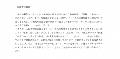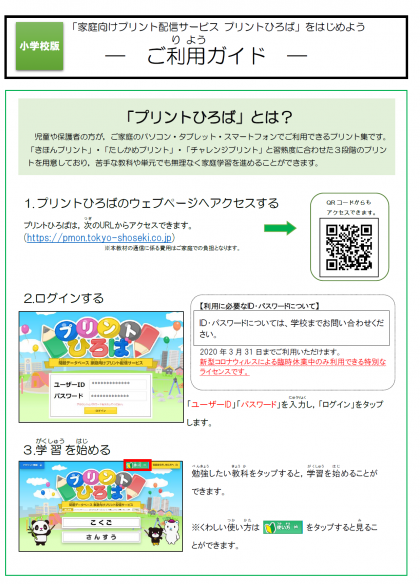 家庭向け学習教材データ「プリントひろば」の配信について 公開日 2020/03/04 更新日 2020/03/04 お知らせ 休業中における児童の家庭学習の取組に向け、必要に応じてご活用ください。 いいね(0)