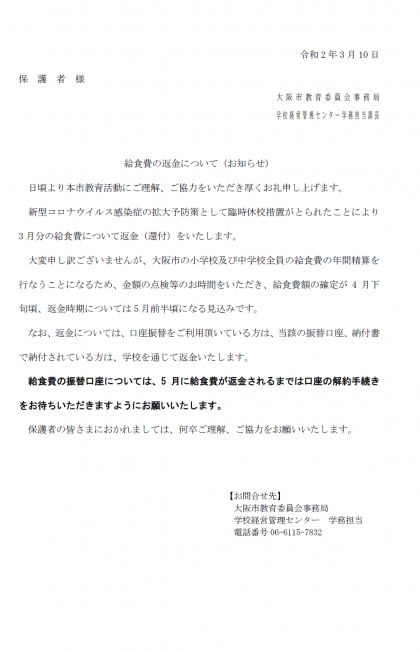 給食費の返金について 公開日 2020/03/12 更新日 2020/03/12 お知らせ 教育委員会より、新型コロナウイルス感染症の拡大予防策として臨時休校措置がとられたことにより3月分の給食費について返金をするとの連絡がありましたので、お知らせいたします。 いいね(0)