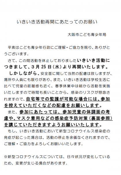 以下のように大阪市こども青年局より文書がきましたのでお知らせいたします。