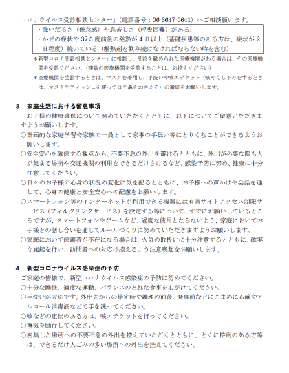 保護者の皆様におかれましても、次のとおり、ご家庭でのお子様の健康状態の把握、感染症予防の指導、ならびに家庭生活の留意事項について、よろしくご理解ご協力を重ねてお願い申しあげます。