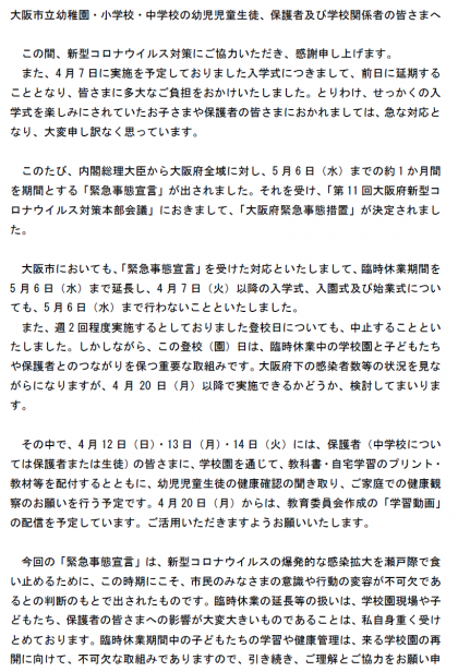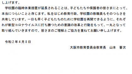 「緊急事態宣言」発令に伴い、教育長より児童・保護者の皆様にメッセージが届いております。