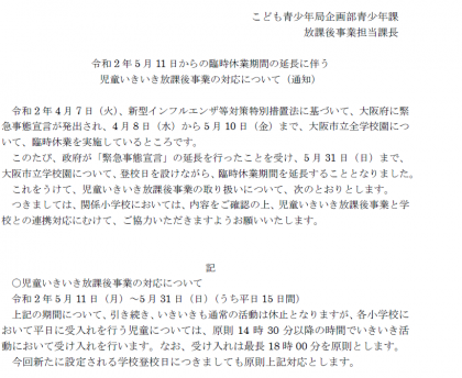 臨時休業期間の延長に伴ういきいき放課後事業の対応について