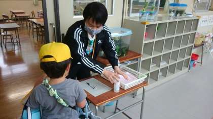 まず教室前で健康観察表を確認します。ご家庭で検温や健康チェックをしていただいたのを確かめてから、手指のアルコール消毒をして教室へ入ります。