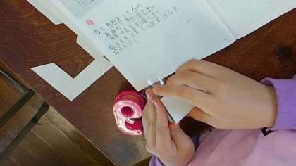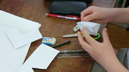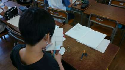 登校日【5月29日(木)】 公開日 2020/05/29 更新日 2020/05/29 お知らせ 展開図が描けたら、切り取って、本当に三角柱になるのか組み立てて確かめました。 「どの辺とどの辺」「どの頂点とどの頂点」が同じになるかが、よくわかりました。 いいね(0)
