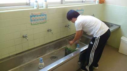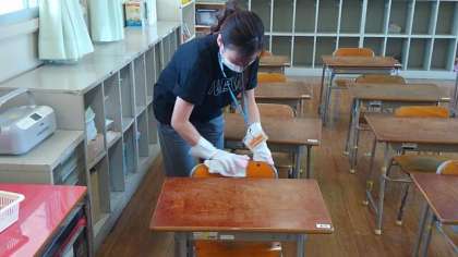 来週から、午前と午後の分散登校ですが、本格的に授業が始まります。どの先生も準備を進めています。特に、消毒作業は欠かせません。心を込めて消毒しながら、来週子どもたちの登校をお待ちしています。